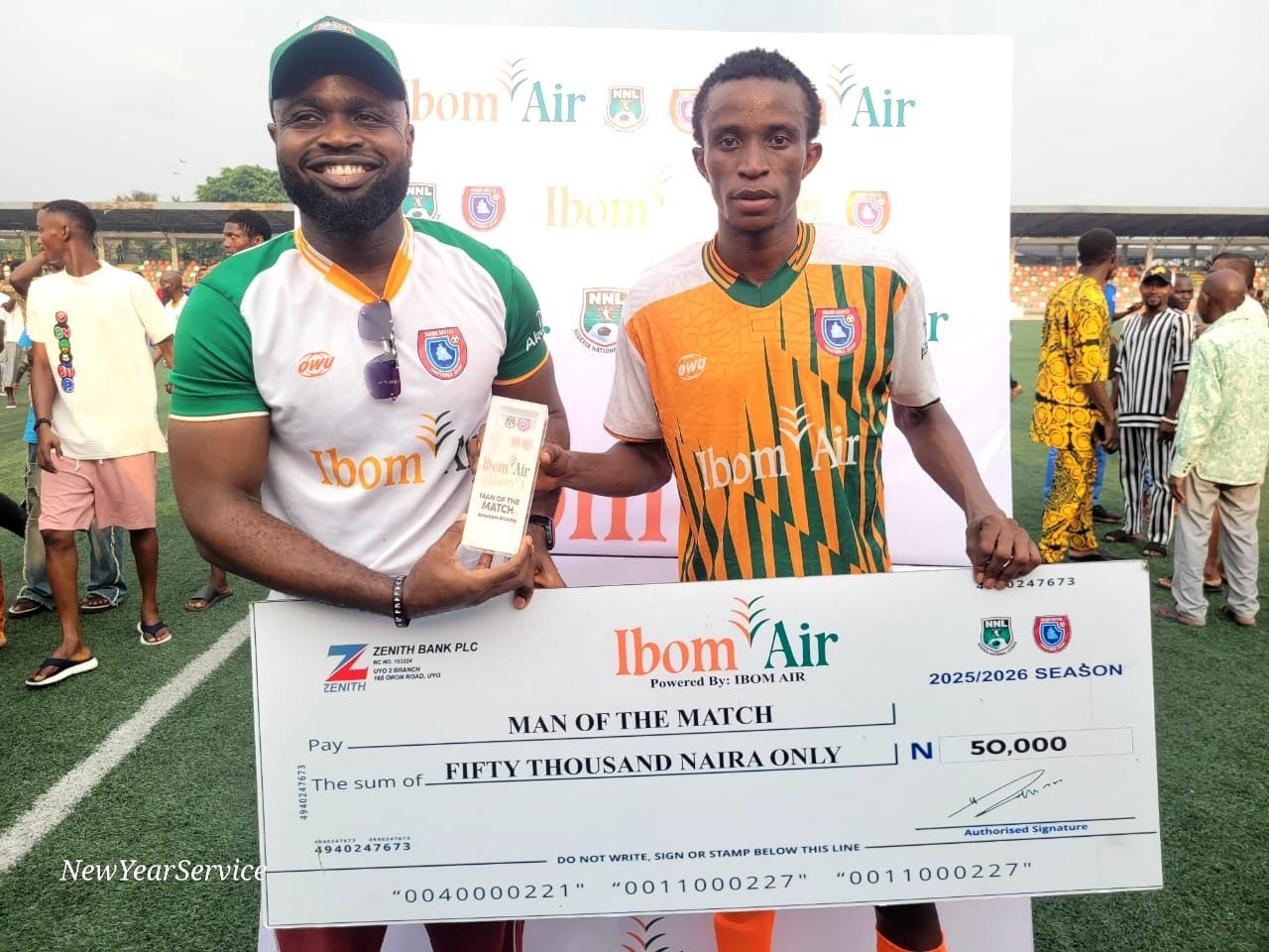 Man of the Match, Charles Etim (right), receiving his award from the Ibom Air official..