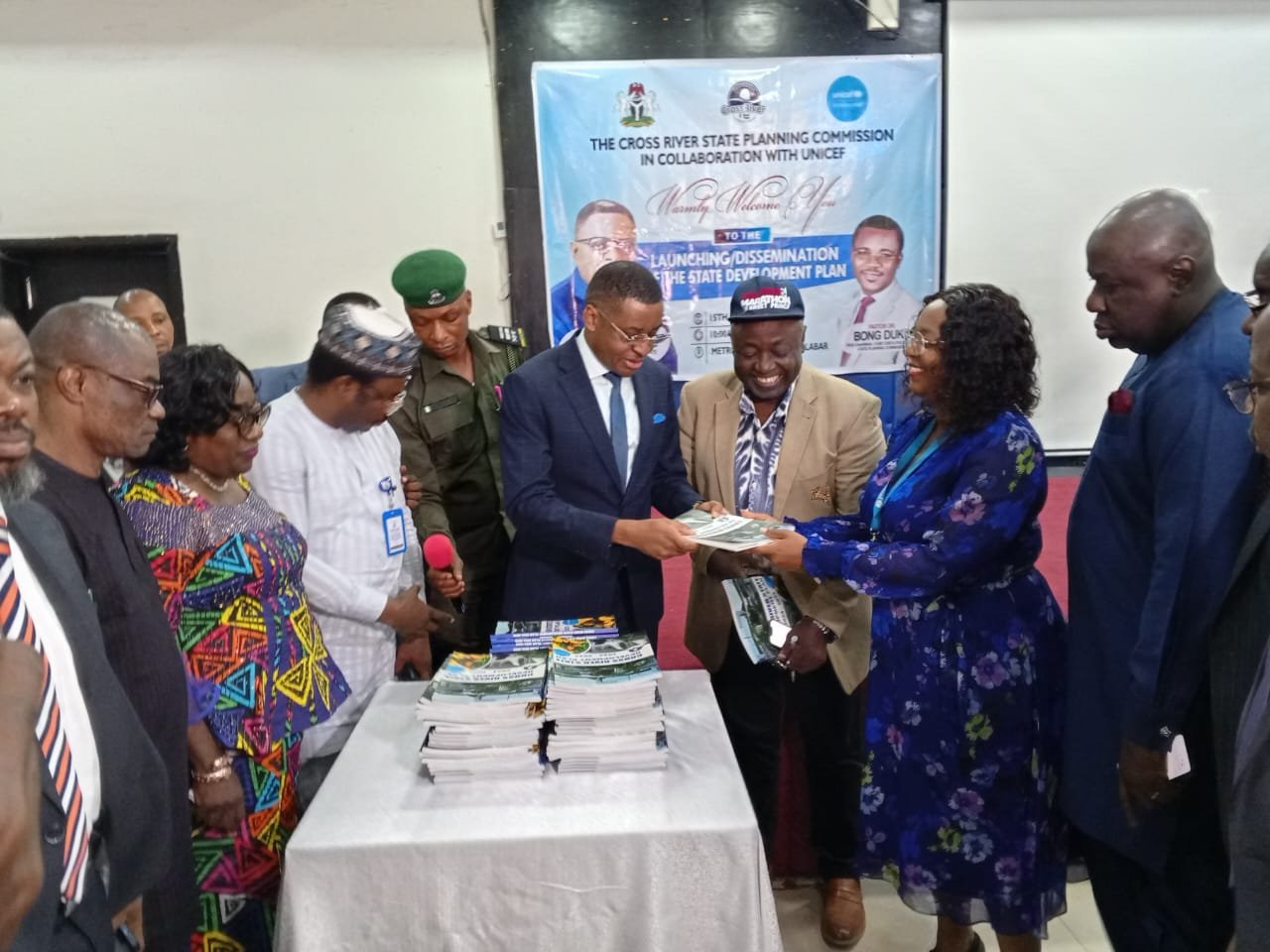 he CRS Deputy Governor, Rt. Hon. Peter Odey, supported by the UNICEF Chief Field Officer, Enugu, Juliet Chiluwe, unveils the SDP on Thursday. while the Health Commissioner,  Dr Henry Ayuk (3rd R) and others look on.