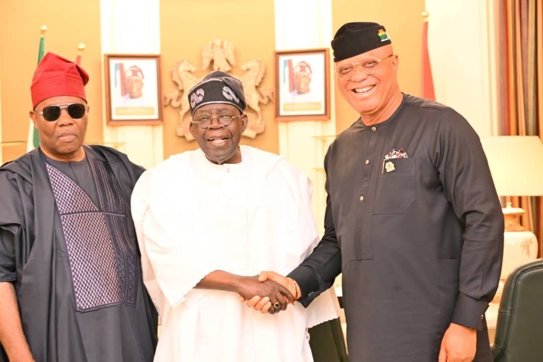 L-R: Senate President, Senator Godswill Akpabio, President Bola Tinubu and Gov. Umo Eno during the visit on Friday.