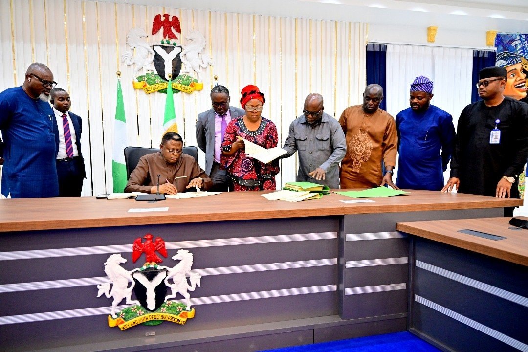Gov. Otu signing the bills into law on June 10, while others watch with keen interest.