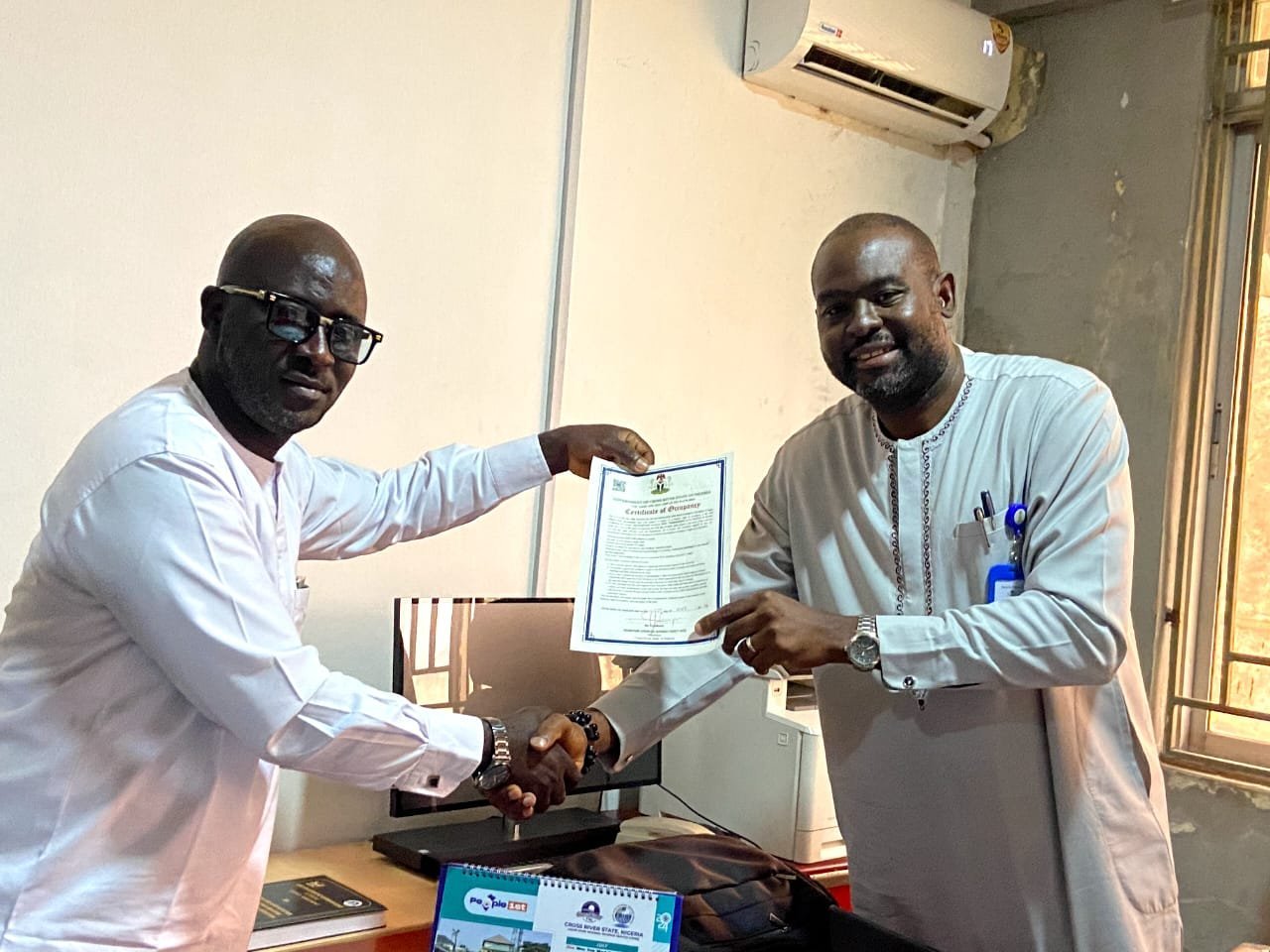 DG CRAGIA, Mr. William Archibong jnr. (R) presenting the C of O to the Rector, IMT, Ugep, Dr. Akintola A. I.