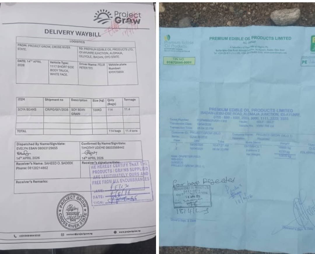 Today, we are pleased to announce that the Cross River State Government, through the “Project Grow” initiative, has successfully delivered its pilot shipment of 114 x 100kg bags of soybeans to Flour Mills Plc in Ibadan, Oyo State. The loading and offloading of the produce were carried out between 18th and 19th today, ensuring proper handling and timely delivery for processing.