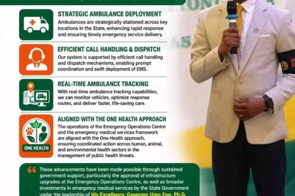 “Distinguished members of the visiting team, I am pleased to provide insights into the operations of the Akwa Ibom State Emergency Medical Services and Ambulance System (AKISEMSAS).” STRATEGIC AMBULANCE DEPLOYMENT Ambulances are strategically stationed across key locations in the State, enhancing rapid response and ensuring timely emergency service delivery. EFFICIENT CALL HANDLING & DISPATCH Our…