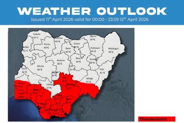 SUNDAY WEATHER OUTLOOK – 12 APRIL 2026 NiMet Forecast | Stay Weather-Smart, Stay Ahead Northern States: Sunny and Hazy with Isolated Thunderstorms Later Morning: Sunny and hazy conditions are expected across the region. Afternoon/Evening: Isolated thunderstorms with moderate rains are expected over: Taraba What this means: Hazy conditions may slightly reduce visibility, while isolated thunderstorms…