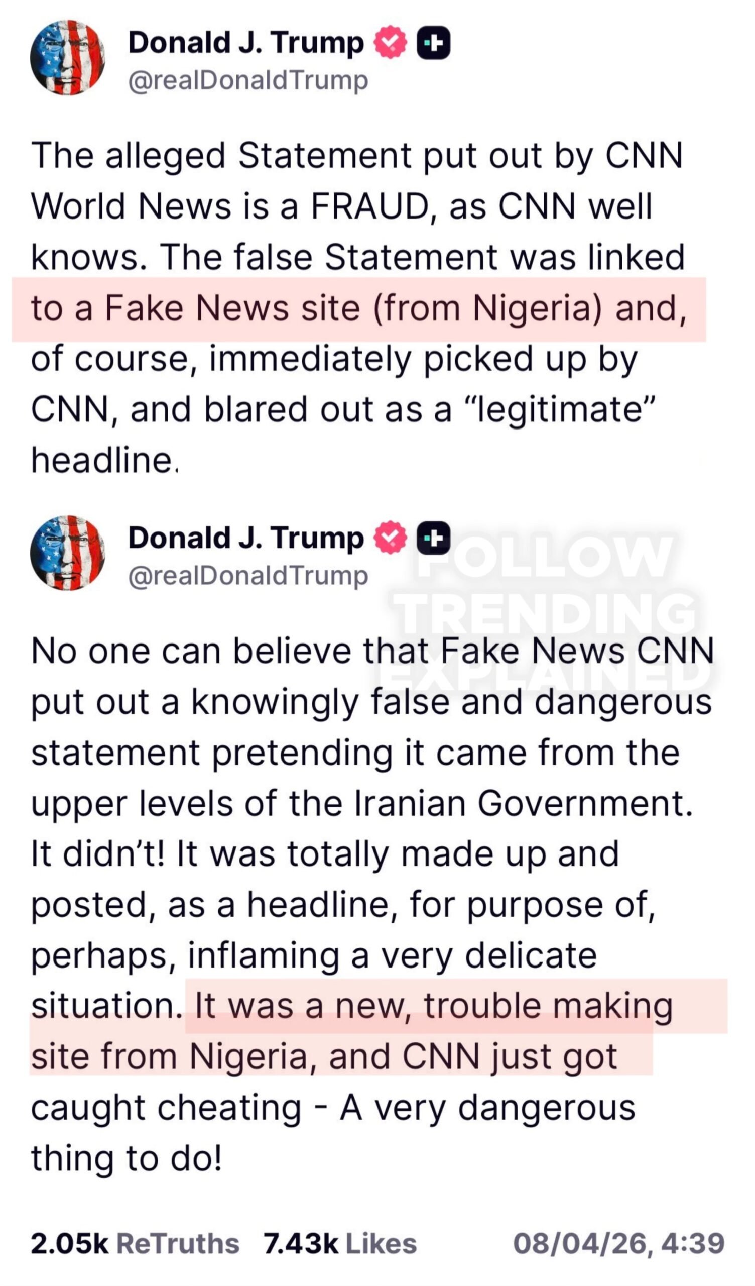 Trump links false statement to fake Nigerian site, threatens CNN over Iran ceasefire announcement